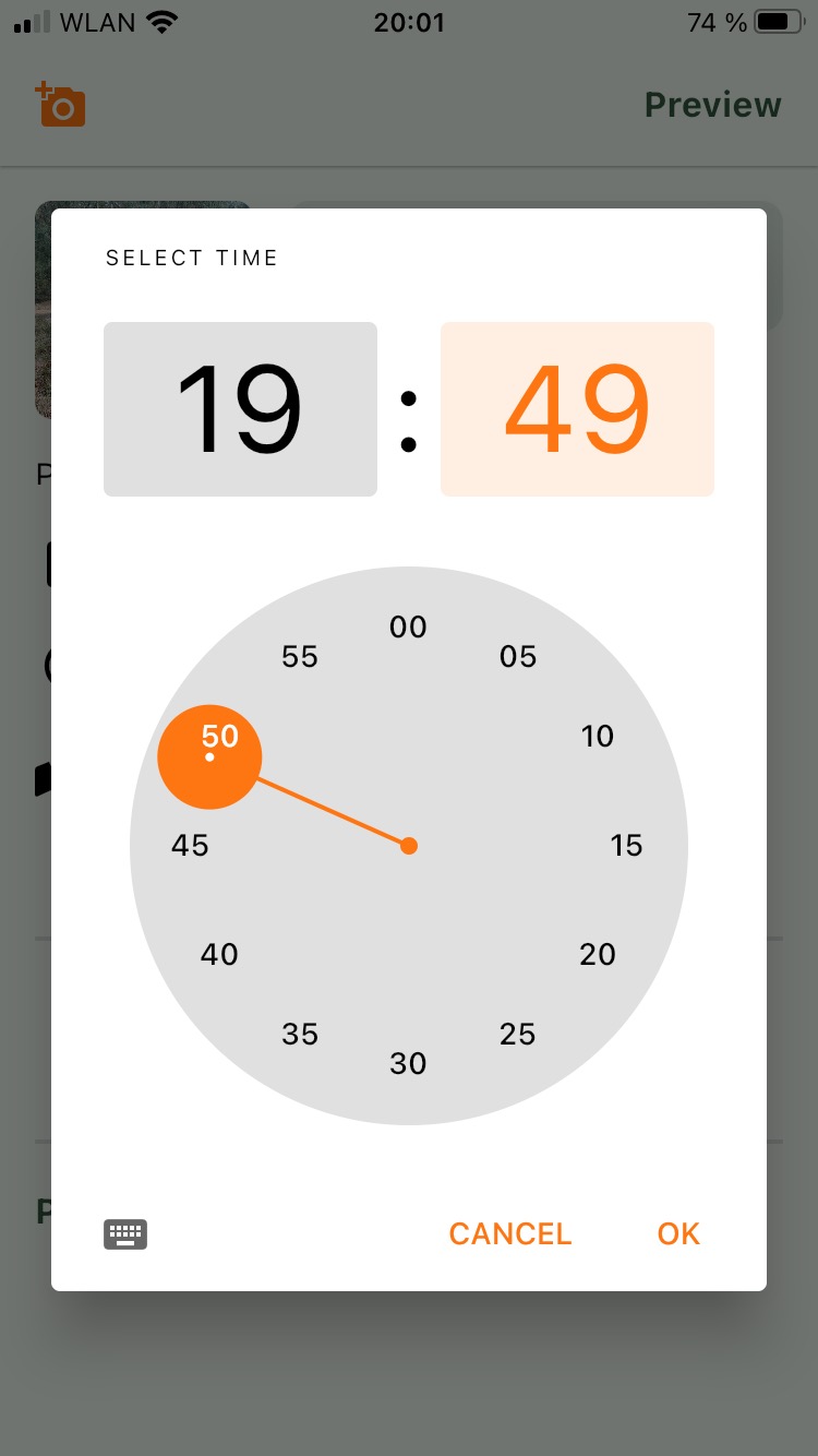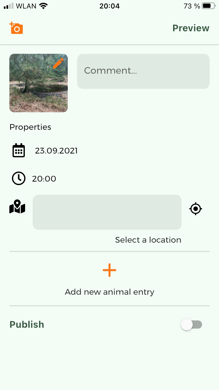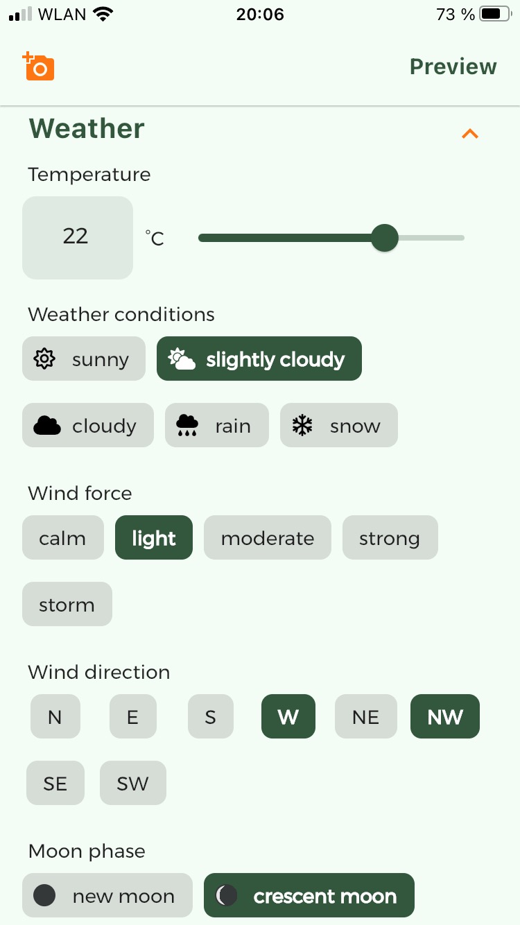By clicking on the big plus in the upper right corner you can select your photos. When you are done, click on "Done" in the upper right corner and you will be taken to filling in the characteristics of your hunting experience. When you are done, click again on "Preview" in the upper right corner where you can add filters to your diary entry. Click on "Create" in the upper right corner and your diary entry is created.